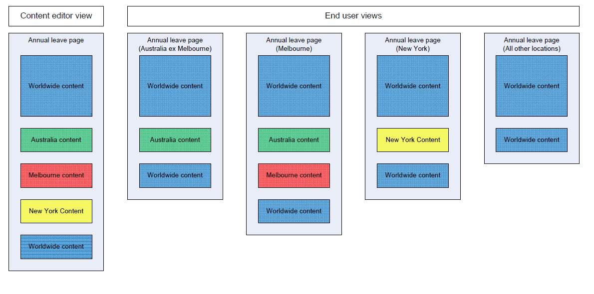 Above: Macquarie Group’s global intranet delivers operational content which is location-specific but also seamlessly integrates global operational content. The above diagram shows the content each user sees relating to the topic “annual leave” based on their location. Screenshot appears courtesy of Macquarie Group.