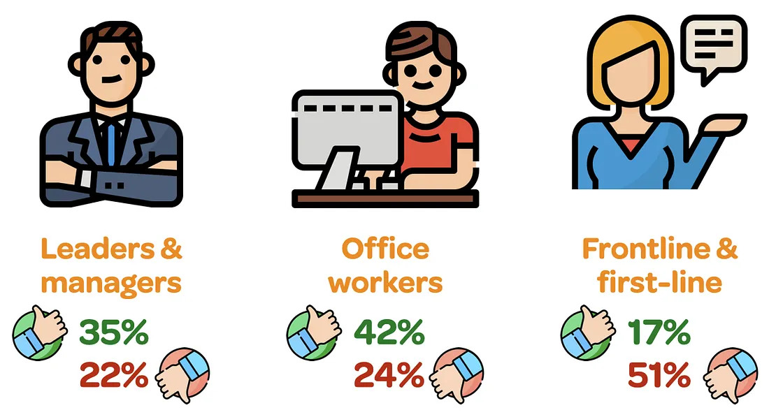 While there were considerable differences across all five groups, the results for frontline and first-line workers were particularly striking. While 45% of respondents indicated office workers had good or very good digital experiences, only 17% could say the same for frontline roles. Equally troubling was the finding that 51% said their experiences were poor or very poor.