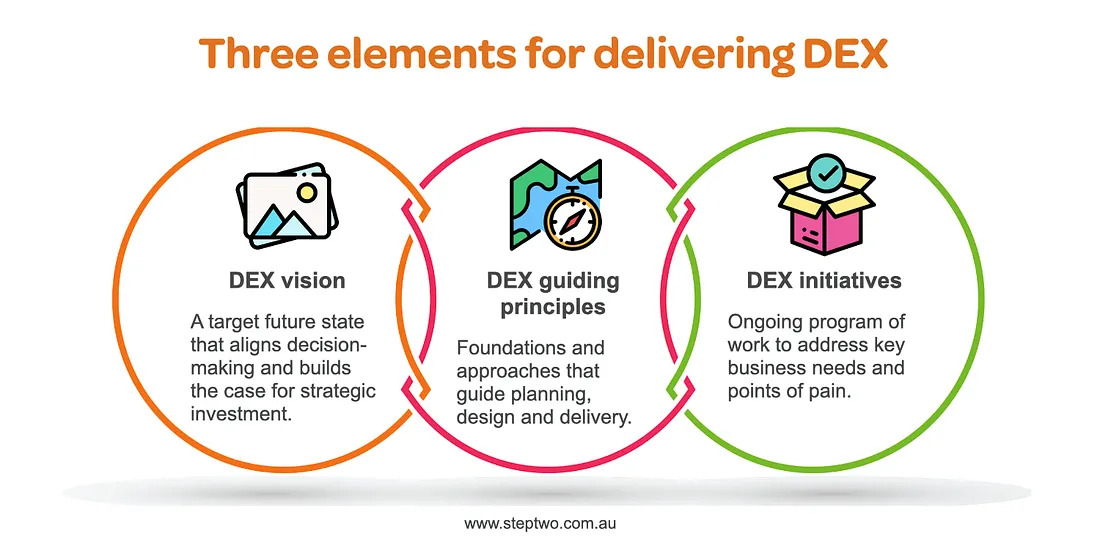 These DEX initiatives will ‘provide the glue’ that delivers a productive experience across multiple systems. They will typically run alongside other activities, seeking to improve outcomes for all rather than competing with other projects.